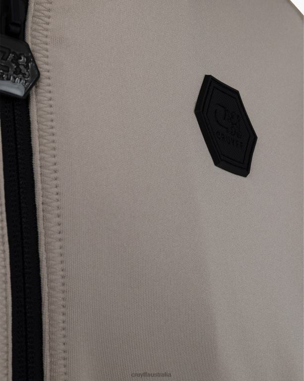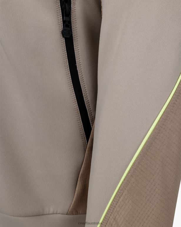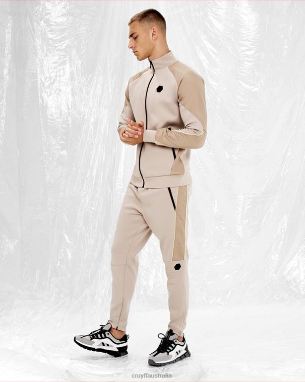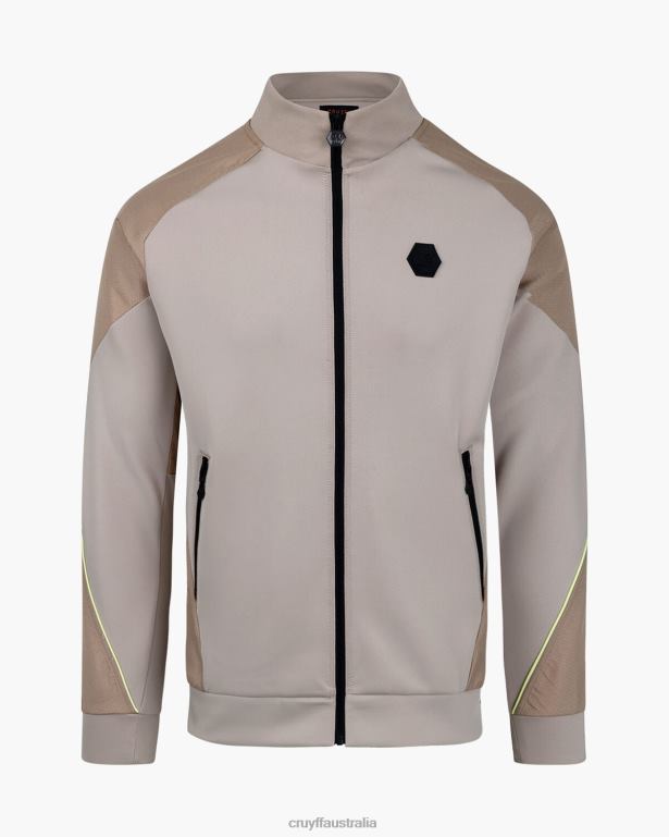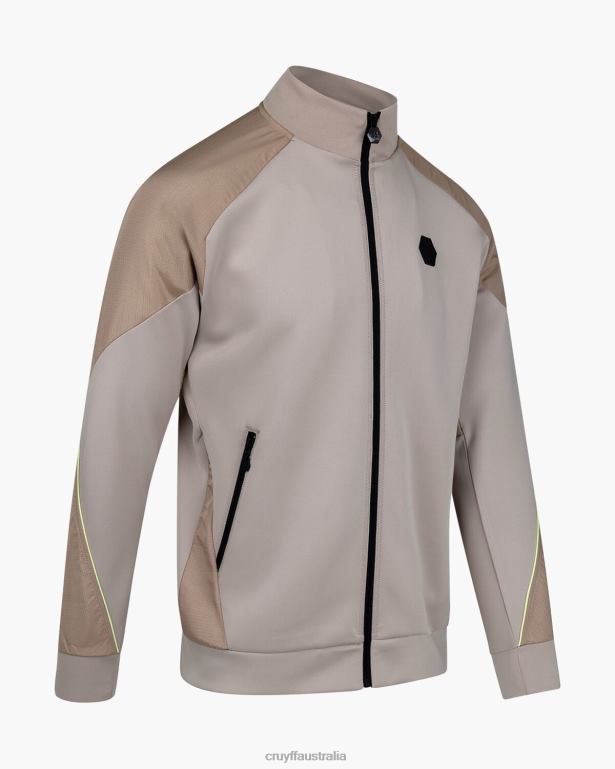 The Cruyff Saul track top for men in sand. A regular fitted zip thru track top made from super stretchy scuba fabric. Provided with two side pockets with zipper and ripstop woven airtex mesh overlays. Detailed with neon piping and a black hexagon badge on the left chest