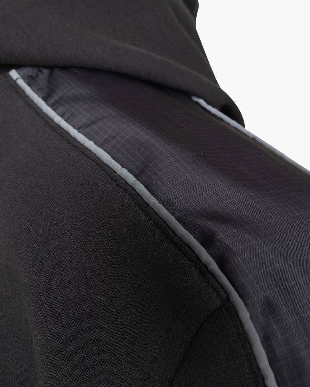 The Cruyff Aiden Track Top in Black is a hooded jacket with zipper, made from a cotton-blend tech fleece; a newly developed fabric that provides a next level comfort. The vivid reflective piping encloses and highlights the ripstop woven overlays. Branded with a solid 3D hexagonal rubber badge on the chest.